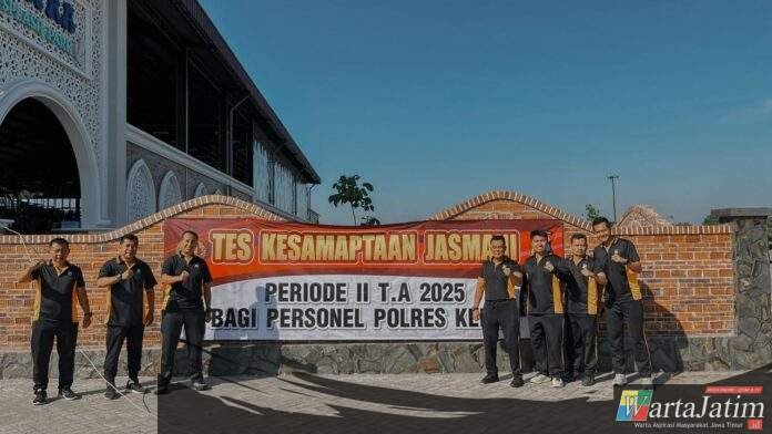 KEDIRI – Wartajatim.id || Jajaran personel Polres Kediri mengikuti Tes Kesamaptaan Jasmani (TKJ) periode II TA 2025 yang digelar di Halaman Masjid Jami’ Imam Baidhowi, Plemahan, Kabupaten Kediri, Selasa (26/8/2025).