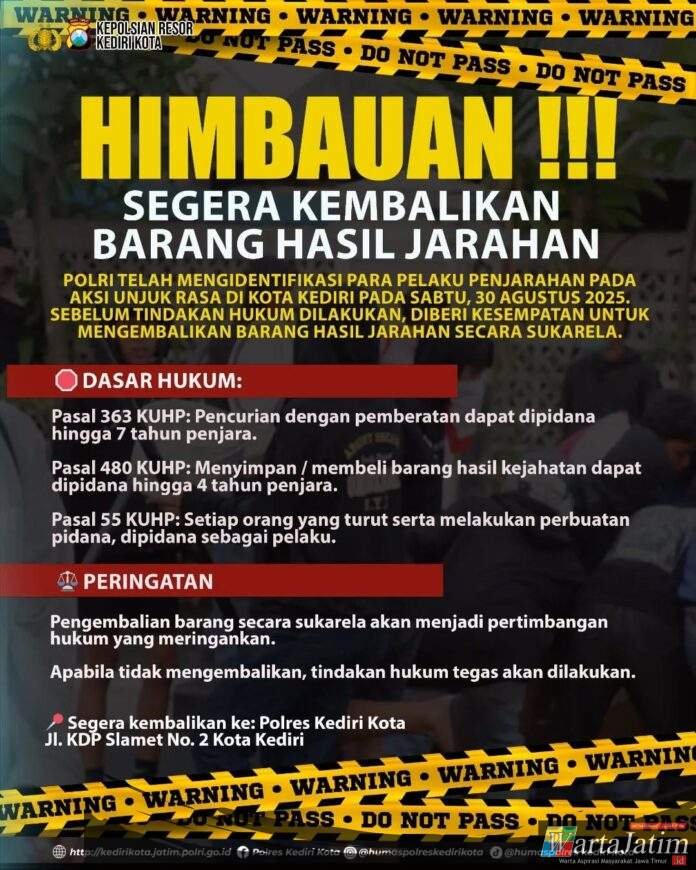 Kediri Kota – Wartajatim.id || Polres Kediri Kota mengeluarkan imbauan tegas kepada masyarakat yang terlibat dalam aksi penjarahan saat unjuk rasa pada Sabtu, 30 Agustus 2025, agar segera mengembalikan barang hasil jarahan.