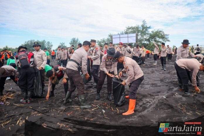 Ratusan personel Polres Lumajang Polda Jatim menyisir bibir pantai membersihkan sampah plastik maupun limbah organik yang terbawa arus laut.