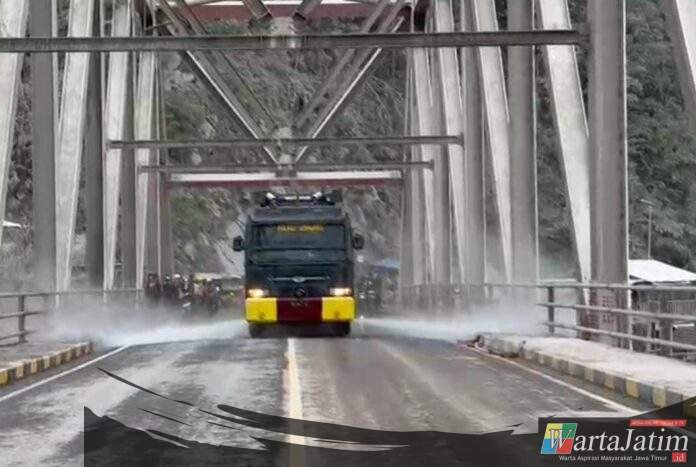 LUMAJANG – Wartajatim.id || Polres Lumajang Polda Jatim mengerahkan satu unit mobil Water Canon (AWC) untuk membantu membersihkan sisa material berupa lumpur dan abu vulkanik Awan Panas Guguran (APG) Gunung Semeru yang menumpuk di kawasan Jembatan Besuk Koboan Kecamatan Candipuro, Kamis (20/11/2025).