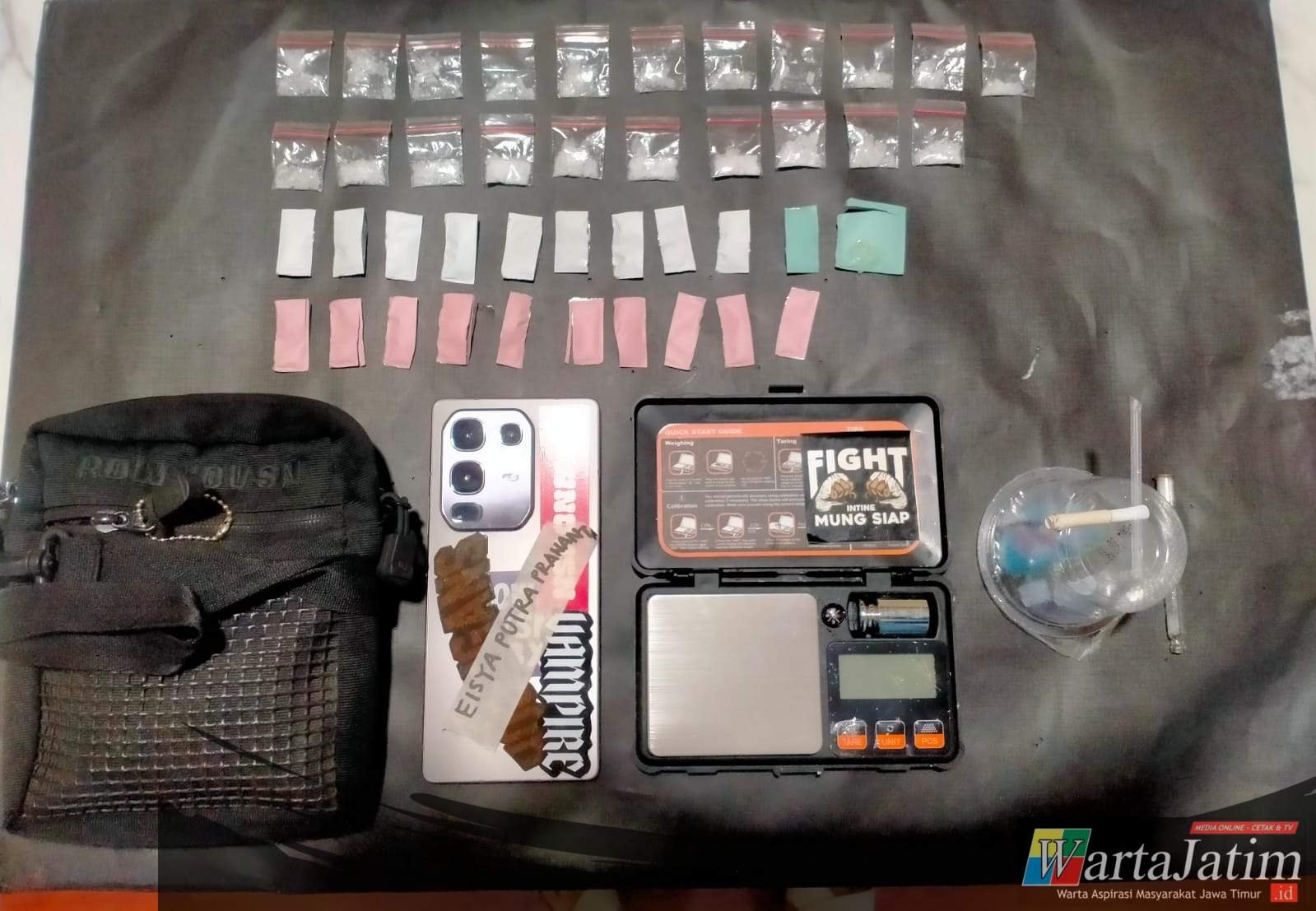 Selain itu, turut diamankan sejumlah barang bukti lain seperti alat hisap, pipet kaca, timbangan digital, hingga ponsel yang diduga digunakan untuk transaksi.