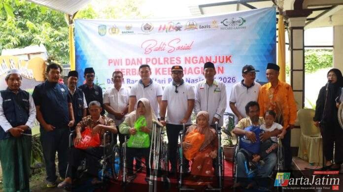 Nganjuk – Wartajatim.id || Kapolres Nganjuk AKBP Suria Miftah Irawan, S.H., S.I.K., M.I.K., bersama Ketua PWI Kabupaten Nganjuk Bagus Jatikusumo menyerahkan bantuan kursi roda kepada penyandang disabilitas serta membagikan paket sembako dalam kegiatan bakti sosial memperingati Hari Pers Nasional (HPN) 2026. Kegiatan tersebut digelar di Kantor Sekretariat PWI Kabupaten Nganjuk, Rabu (18/2/2026).
