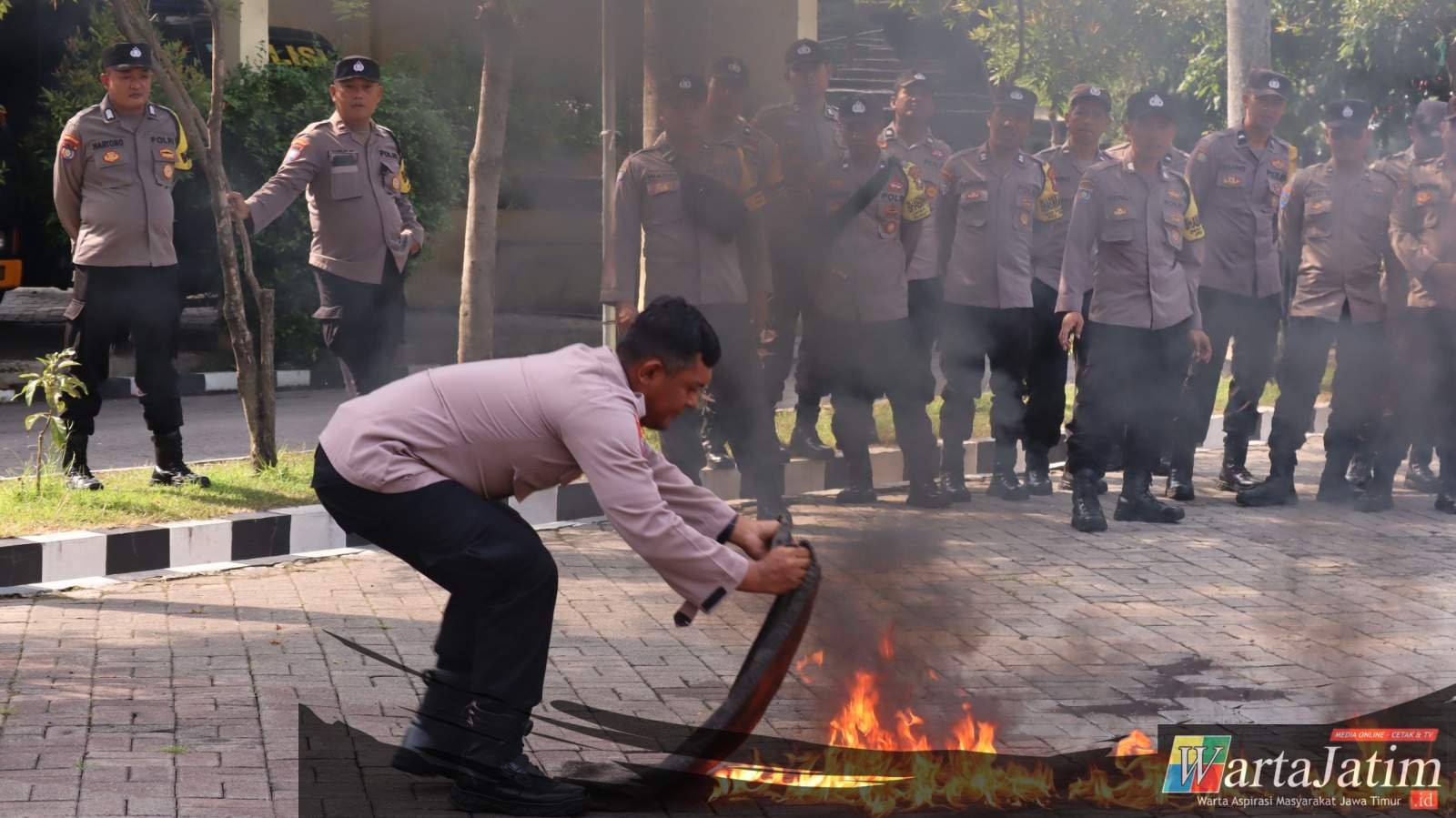 Nganjuk – Wartajatim.id || Polres Nganjuk menggandeng Dinas Pemadam Kebakaran dan Penyelamatan (Damkar) serta Dinas Komunikasi dan Informatika (Kominfo) Kabupaten Nganjuk guna meningkatkan kemampuan dan kecakapan Bhabinkamtibmas dalam penanganan pertama kebakaran, situasi darurat, sekaligus deteksi dini penyebaran berita hoaks. Kegiatan tersebut dilaksanakan di lapangan apel Polres Nganjuk dan dipimpin langsung oleh Wakapolres Nganjuk, Kamis (18/12/2025).