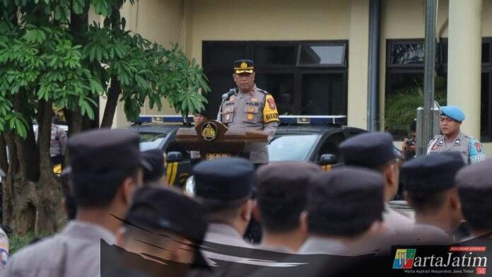 Apel dilaksanakan di Lapangan Apel Polres Nganjuk dan dipimpin Wakapolres Nganjuk KOMPOL Andria Diana Putra, S.E., M.H., mewakili Kapolres Nganjuk dengan membacakan amanat Kapolres.