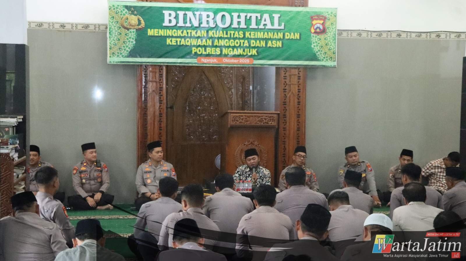 Nganjuk – Waetajatim.id || Polres Nganjuk kembali menggelar kegiatan pembinaan rohani dan mental (Binrohtal) di Masjid Al-Ikhlas Polres Nganjuk, Kamis (30/10/2025). Kegiatan ini diikuti oleh Pejabat Utama (PJU), anggota, serta ASN Polres Nganjuk dengan penuh khidmat, menghadirkan Ulama Kamtibmas Polsek Wilangan, Ustadz Suroya Diro Akbar, S.H., sebagai penceramah.