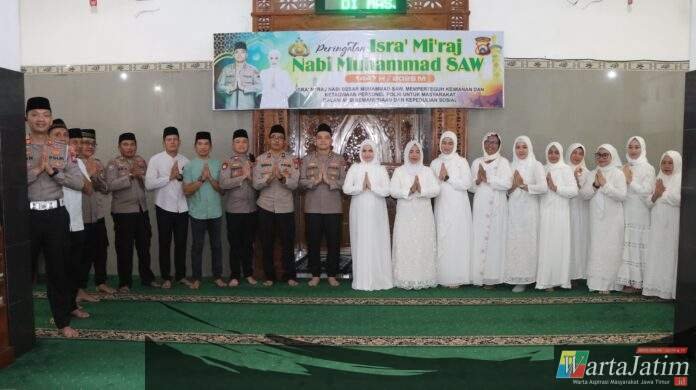 Nganjuk – Wartajatim.id || Polres Nganjuk menggelar Peringatan Isra Mi’raj Nabi Muhammad SAW 1447 Hijriah/2026 Masehi dengan mengusung tema “Memperteguh Keimanan dan Ketaqwaan Personel Polri untuk Masyarakat dalam Aksi Kemanusiaan dan Kepedulian Sosial dengan Merujuk Keteladanan Nabi Zakaria”. Kegiatan keagamaan tersebut dilaksanakan di Masjid Al Ikhlas Polres Nganjuk dan diikuti oleh Kapolres Nganjuk, pejabat utama, personel Polri, ASN Polres Nganjuk serta Bhayangkari, Jumat (30/01/2026).