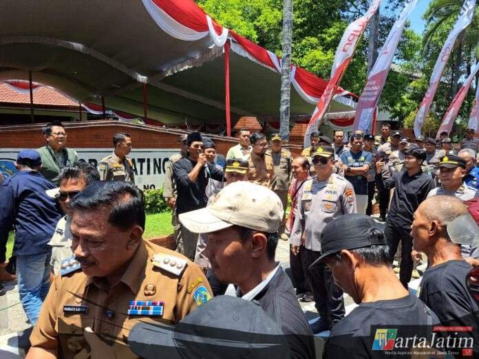 Nganjuk – Wartajatim.id || Polres Nganjuk menerjunkan personel untuk mengamankan jalannya aksi unjuk rasa dari Aliansi RT dan RW se-Kabupaten Nganjuk yang menuntut kenaikan insentif sebesar Rp500.000 per bulan. Aksi digelar di dua titik yaitu di halaman DPRD Kabupaten Nganjuk dan Depan Kantor Pemkab Nganjuk dengan pengamanan dari Polres Nganjuk dibantu oleh TNI dan Satpol PP dengan mengedepankan cara bertindak humanis dan persuasif, Senin (29/9/2025).