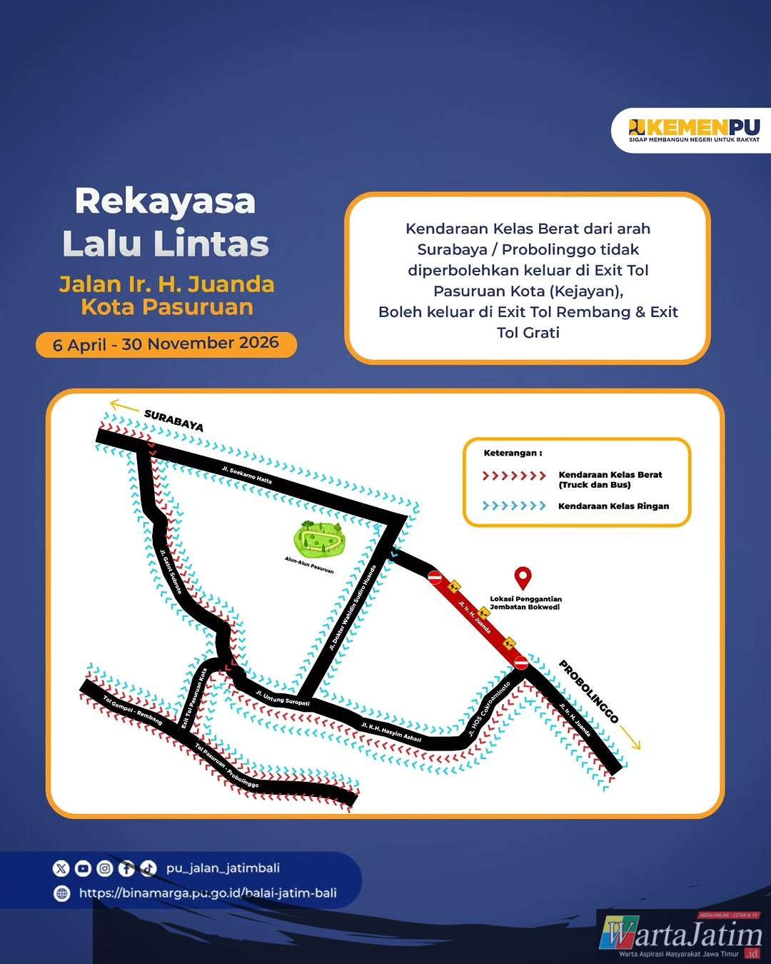 Kebijakan ini dilakukan sebagai dampak dari pembongkaran Jembatan Bok Wedi yang terletak di Jalan Raya Ir H Juanda, Kelurahan Blandongan, Kecamatan Bugulkidul, Kota Pasuruan, menjadi akses vital bagi masyarakat.