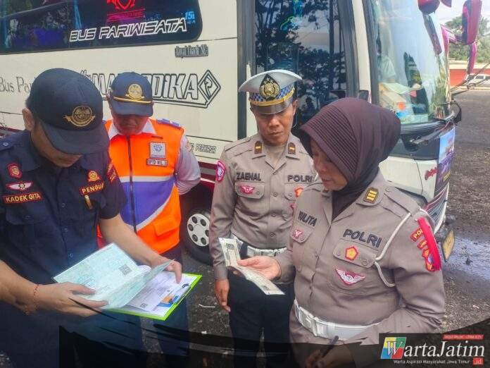 PROBOLINGGO — Wartajatim.id || Dalam rangka menciptakan keamanan, keselamatan, ketertiban dan kelancaran lalu lintas (Kamseltibcarlantas) menyambut libur Natal 2025 dan Tahun Baru 2026 (Nataru) Polres Probolinggo Polda Jatim melaksanakan rampcheck bus pariwisata dan pemeriksaan kesehatan bagi pengemudi di Rest Area Bromo Kabupaten Probolinggo. Sabtu (27/12/2025).