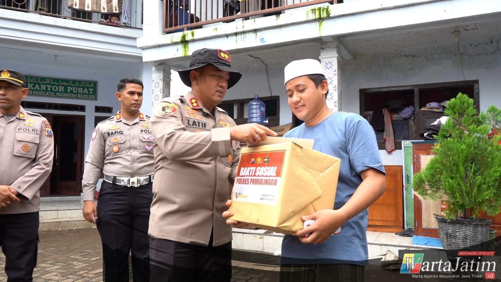 Pada kesempatan tersebut, Kapolres Probolinggo juga menyalurkan bantuan sosial berupa bingkisan bahan kebutuhan pokok kepada warga terdampak banjir dan pihak pondok pesantren.