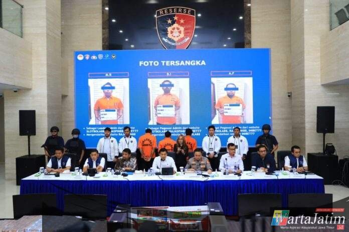 Jakarta – Wartajatim.id || Direktorat Tindak Pidana Siber Bareskrim Polri berhasil mengungkap sindikat judi online berskala nasional dan internasional yang beroperasi melalui tiga website besar, yakni Slot Bola 88, Raja Spin 88, dan Inibet 77. Dalam operasi ini, penyidik menangkap tiga tersangka, menyita uang tunai senilai Rp16,4 miliar, serta memblokir 76 rekening dengan nilai transaksi mencapai Rp63,7 miliar.