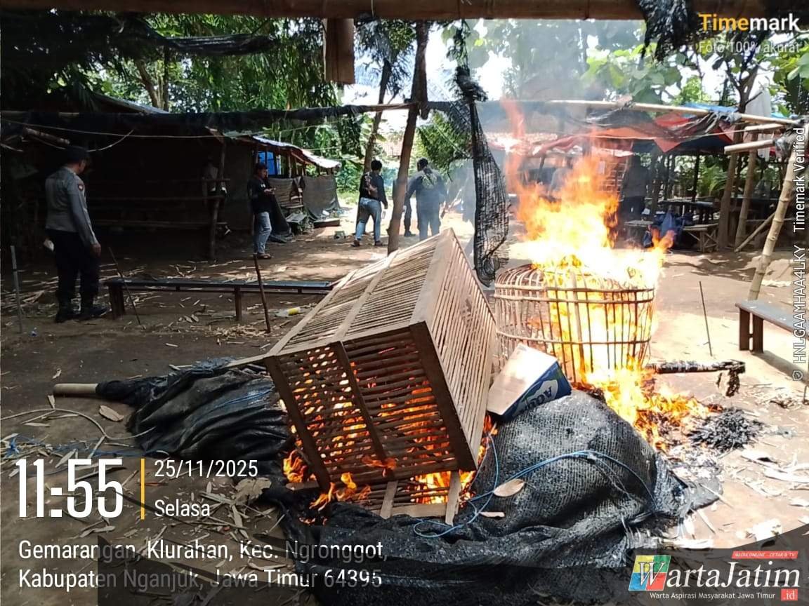 Nganjuk – Wartajatim.id || Polsek Ngronggot bersama Unit Resmob Satreskrim Polres Nganjuk membongkar lokasi yang diduga dijadikan arena perjudian sabung ayam di lahan kosong belakang rumah warga di Desa Klurahan, Kecamatan Ngronggot, Kabupaten Nganjuk, Selasa (25/11/2025).