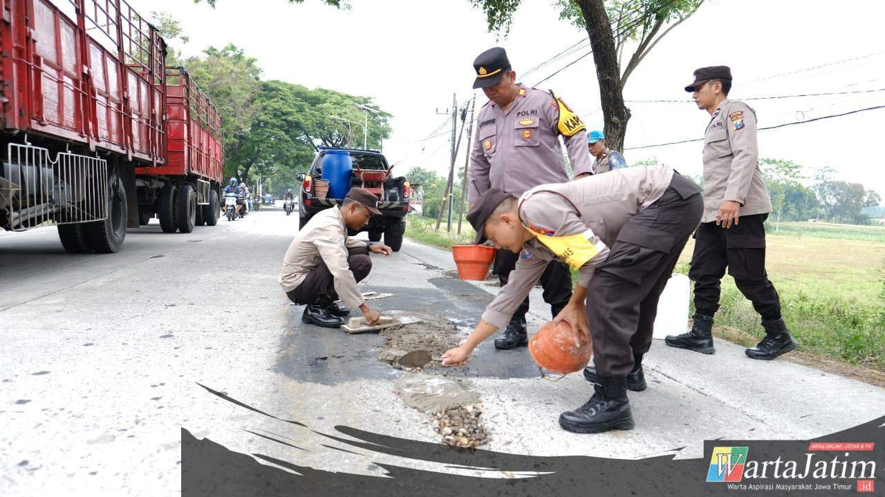 Kapolsek Plemahan AKP Gatot Pesantoro bersama anggota turun langsung menambal lubang yang dinilai rawan menyebabkan kecelakaan, Selasa (30/9/2025).