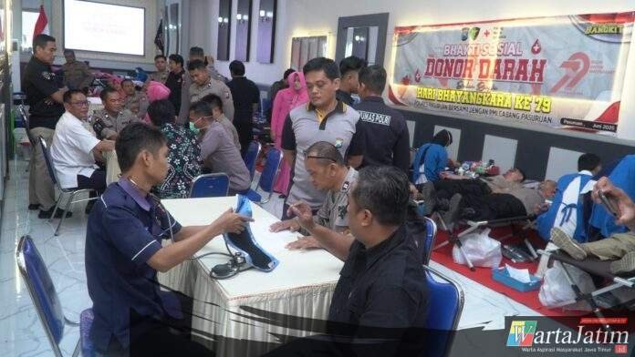PASURUAN – Wartajatim.id || Menyambut Hari Bhayangkara ke-79 tahun 2025, Polres Pasuruan Polda Jatim menggelar kegiatan bakti kesehatan, donor darah.