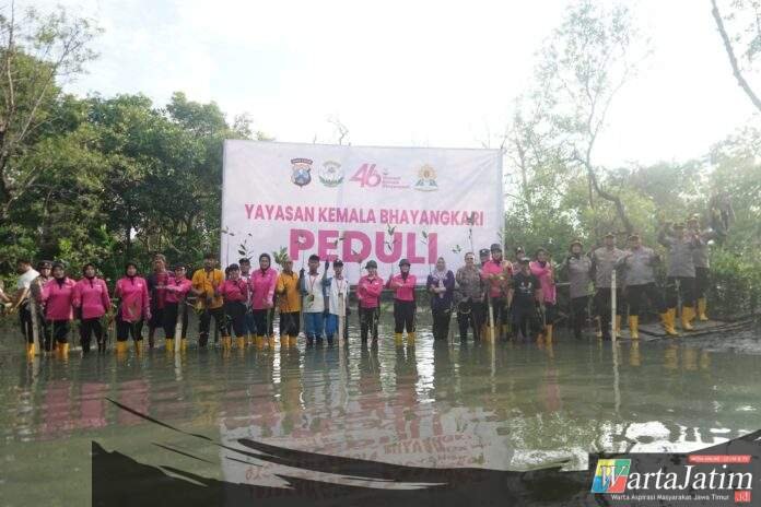 Yayasan Kemala Bhayangkari (YKB) Cabang Polres Pelabuhan Tanjung Perak melakukan aksi nyata pemulihan lahan kritis dengan menanam ratusan bibit pohon mangrove dan bakau di kawasan tersebut, Rabu (22/4/2026) pagi.