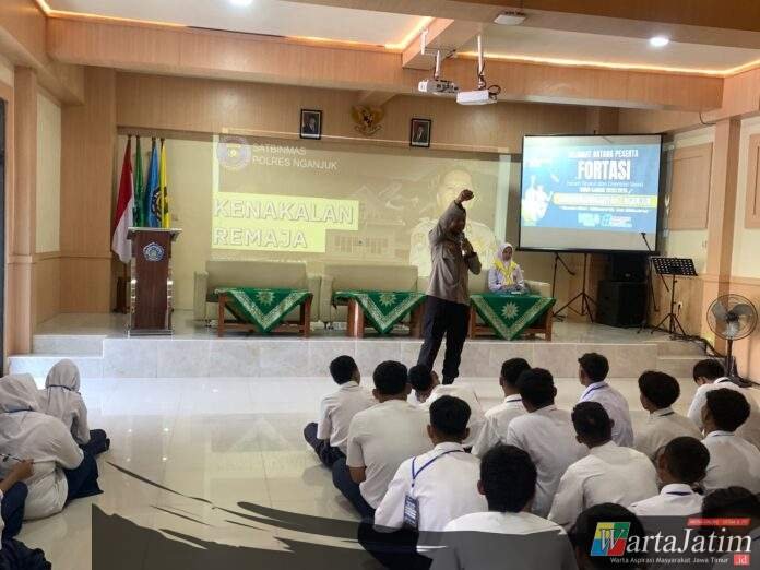 Nganjuk – Wartajatim.id || Guna menanamkan karakter disiplin sejak dini kepada pelajar, Sat Binmas Polres Nganjuk menjadi pemateri dalam kegiatan Masa Pengenalan Lingkungan Sekolah (MPLS) di SMK Muhammadiyah 1 Nganjuk, Senin (14/7/2024).