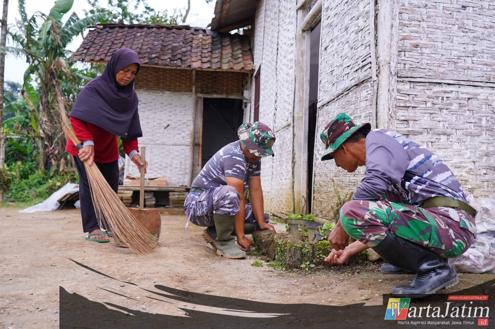 Blitar – Wartajatim.id || Semangat pengabdian personel TNI yang tergabung dalam Satgas TMMD ke-127 Kodim 0808/Blitar tidak surut meski sedang menjalankan ibadah puasa. Di sela-sela waktu menunggu berbuka puasa atau ngabuburit, sejumlah personel Satgas yang dipimpin Pelda Fendri dari TNI AL Lanal Malang berinisiatif membantu membersihkan rumah salah satu warga di lokasi sasaran TMMD Desa Krisik Kecamatan Gandusari, Senin (9/3/2026).
