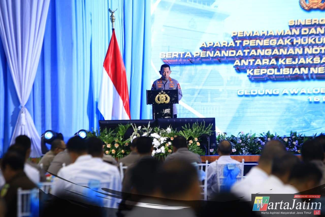 Jakarta — Wartajatim.id || Kepala Kepolisian Negara Republik Indonesia (Kapolri) Jenderal Polisi Listyo Sigit Prabowo menegaskan pentingnya sinergi antarpenegak hukum dalam pelaksanaan Kitab Undang-Undang Hukum Pidana (KUHP) dan Kitab Undang-Undang Hukum Acara Pidana (KUHAP) yang baru. Hal tersebut disampaikan Kapolri dalam kegiatan penandatanganan Nota Kesepahaman (MoU) yang dilanjutkan dengan Perjanjian Kerja Sama (PKS) antara Kepolisian dan Kejaksaan.