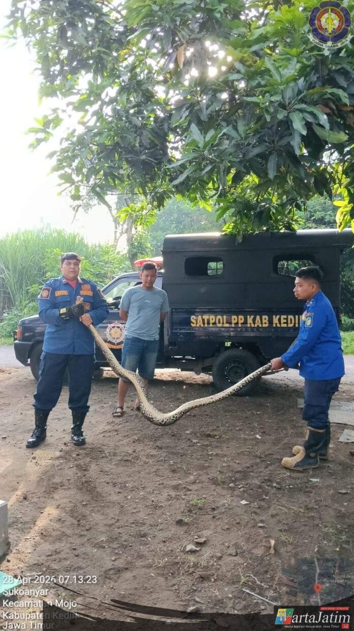KEDIRI – Wartajatim.id || Seekor Ular Piton berukuran sekitar 2,5 meter gegerkan warga Dusun tempursari, Desa sukoanyar RT 004 RW 001, Kecamatan Mojo, Kabupaten Kediri Jawa Timur (Jatim), Selasa (28/4/2026).