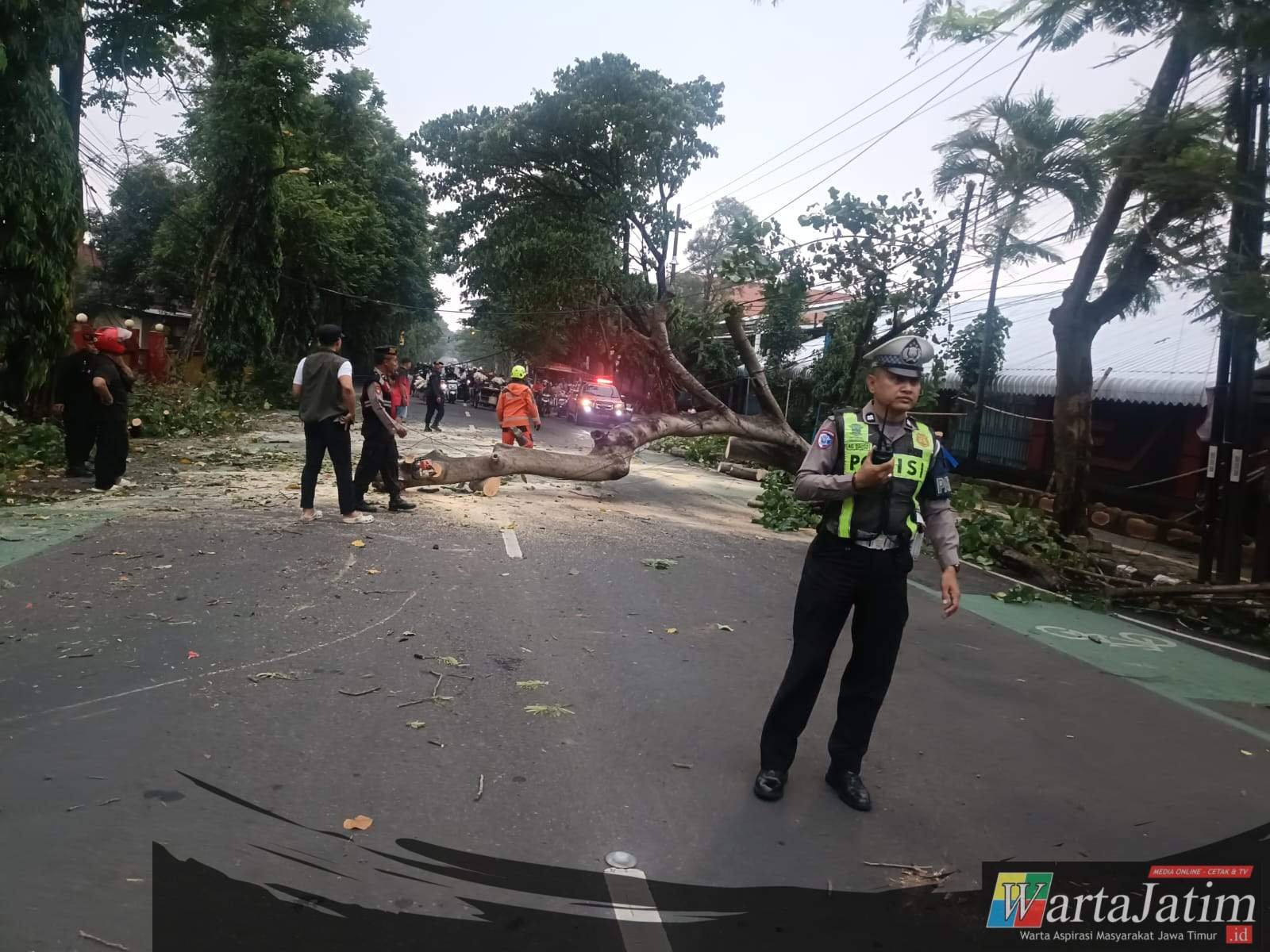 Unit Turjagwali Satlantas Polres Kediri Kota Bersama Dinas Terkait Lakukan Evakuasi Pohon Tumbang di Jalan Veteran